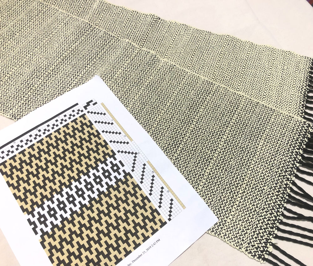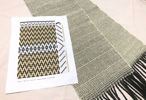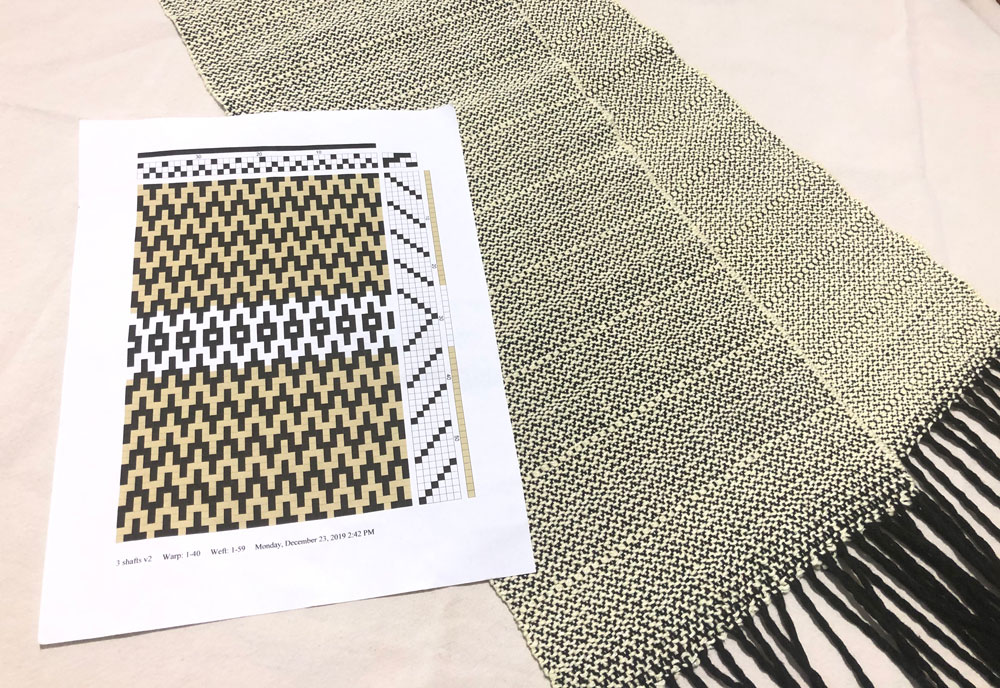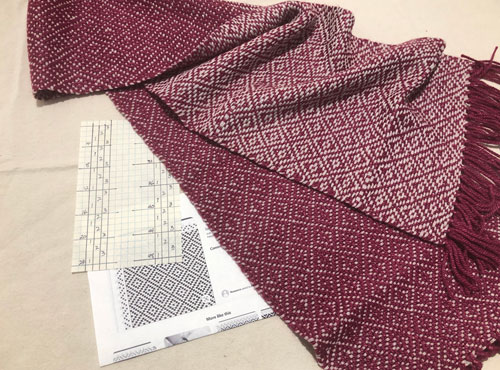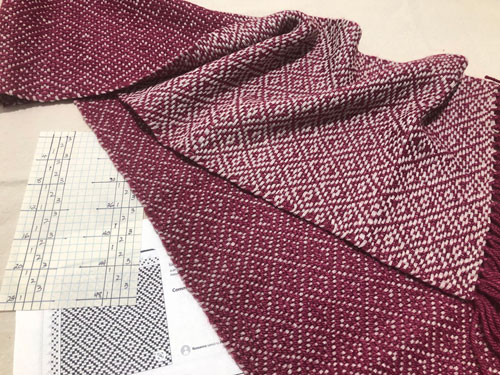Carol worked up this orignal three shaft pattern. What clever use of color in the weave.