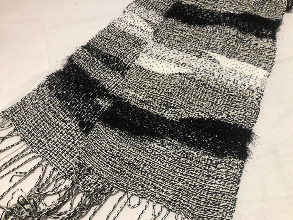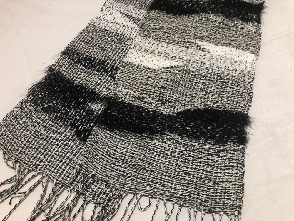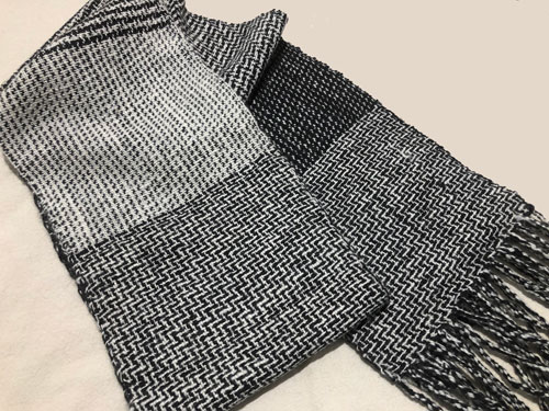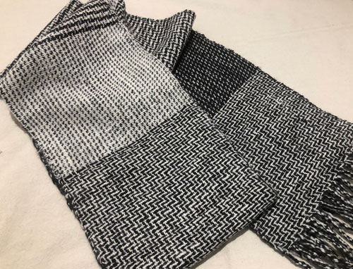 Three shaft woven in standard denim twill. The different areas depended on the alternating of 1, 2 or 4 wefts of black or white. Makes for an interesting gamp.
