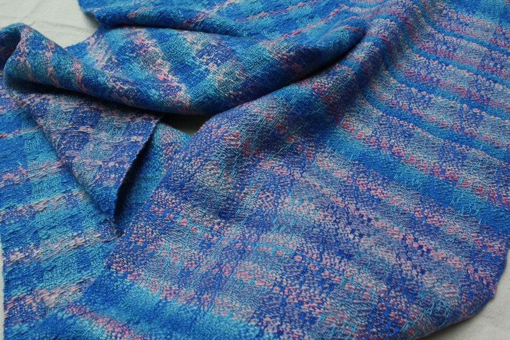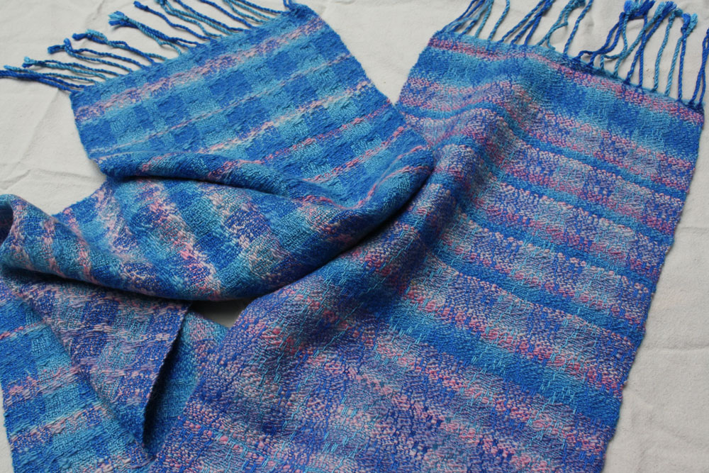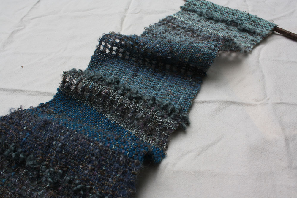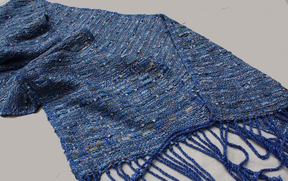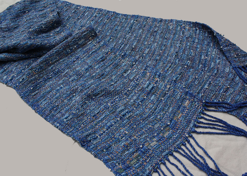 Terry has been looking for a use for his hand spun and this is it. The warp is commercial bamboo. The hand spun is pre dyed fleece of blue faced Leiscter sheep.