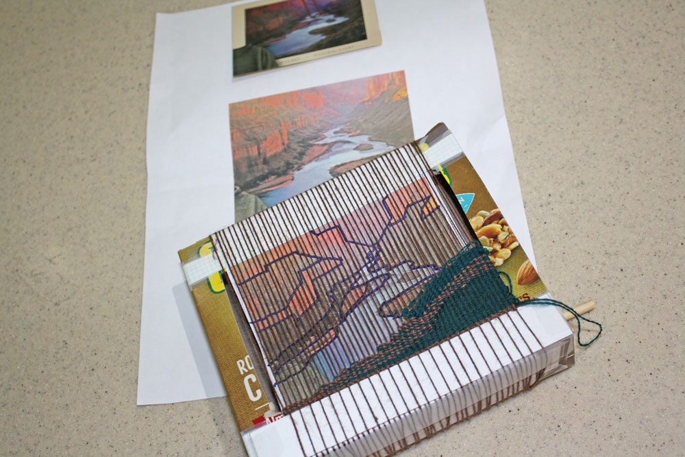 Carie tackled tapestry by using a box as the loom for her piece. She said that tapestry is not for her but it certainly looks good here.