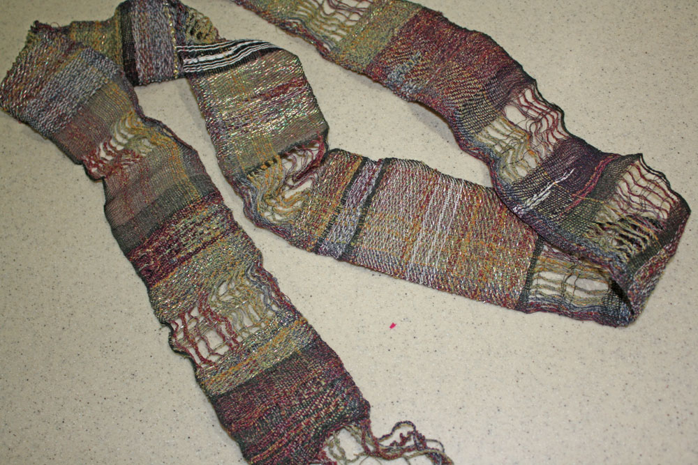 She used all kinds of out of the box (normal?) yarn to weave this piece. Also note the leno between the solid woven parts.