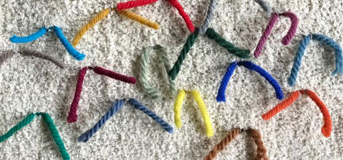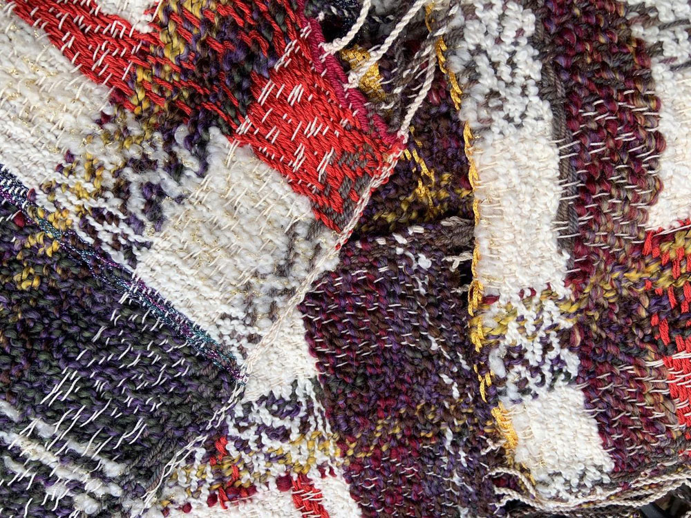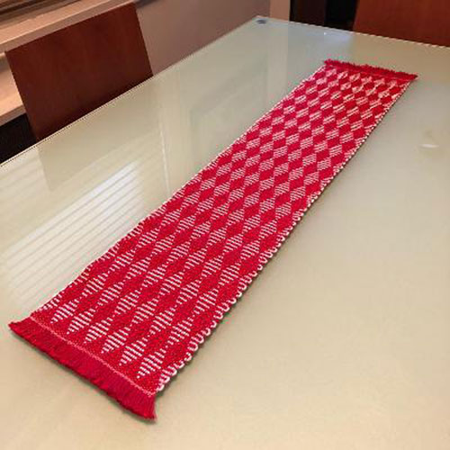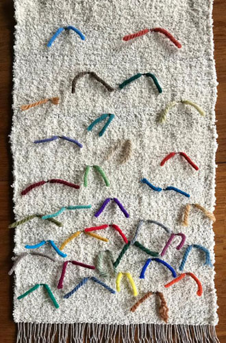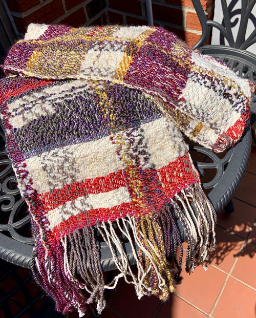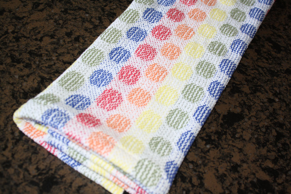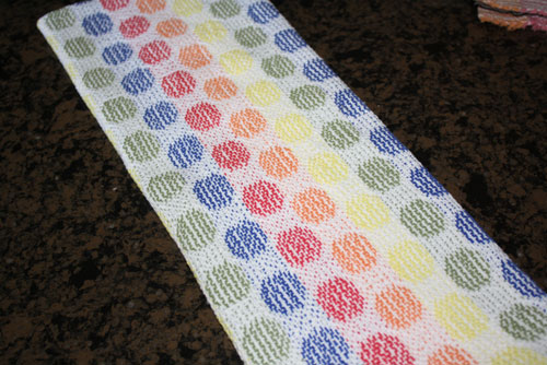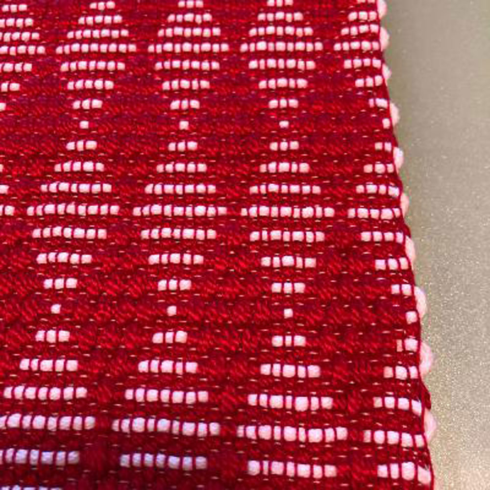The weave has a tabby of 20/2 cotton with mop yarn for the pattern. It has the bumpy feel of rep weave but it’s classified as diversified plain weave on 8 shafts. .