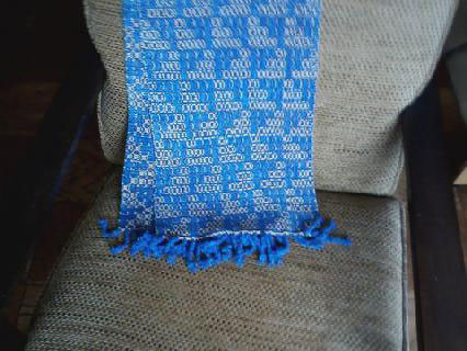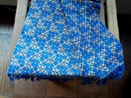 Terry had a lot of problems weaving this. For some reason my loom was in rebellion and kept dropping some tie ups. He got this far (one towel!) and gave up. It was to be a whole set of them but he just couldn't go on with it and sacrificed the remainder of the warp.