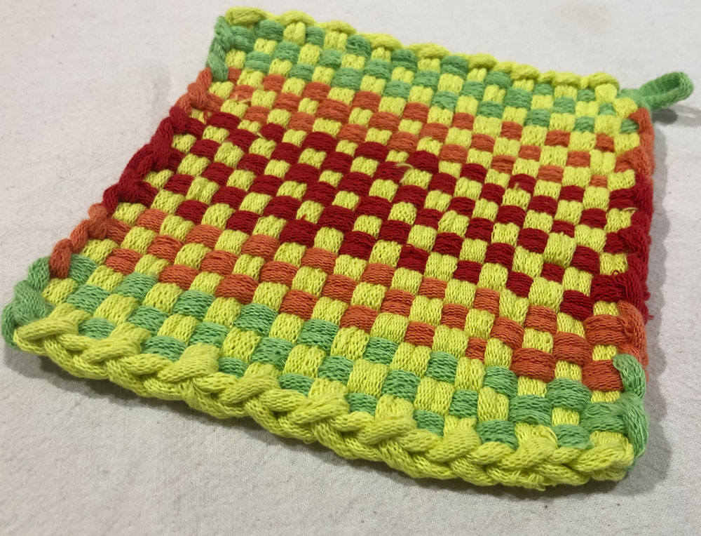Carie created this charming pot holder on a trip with her husband. Pot holder looms are a lot easier to use while traveling.