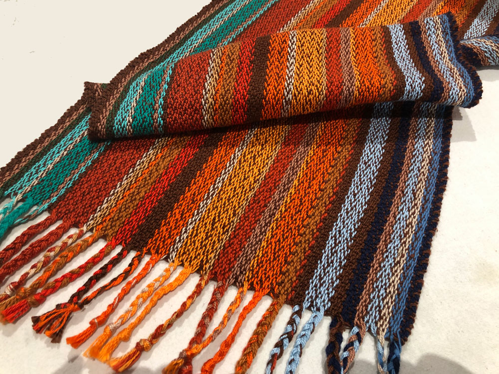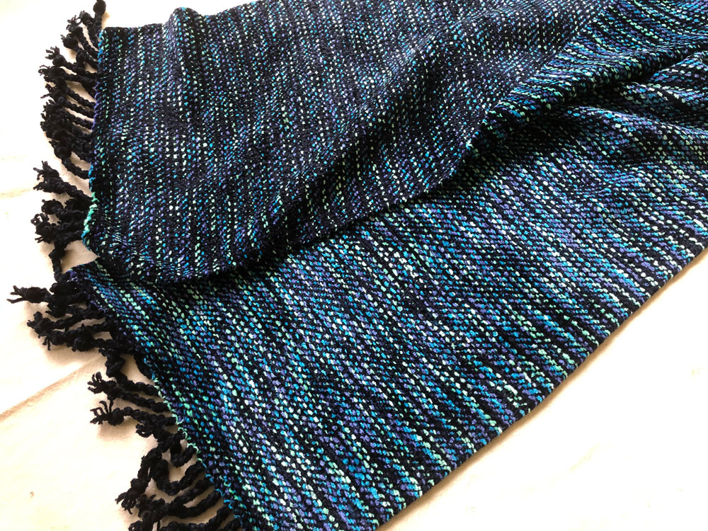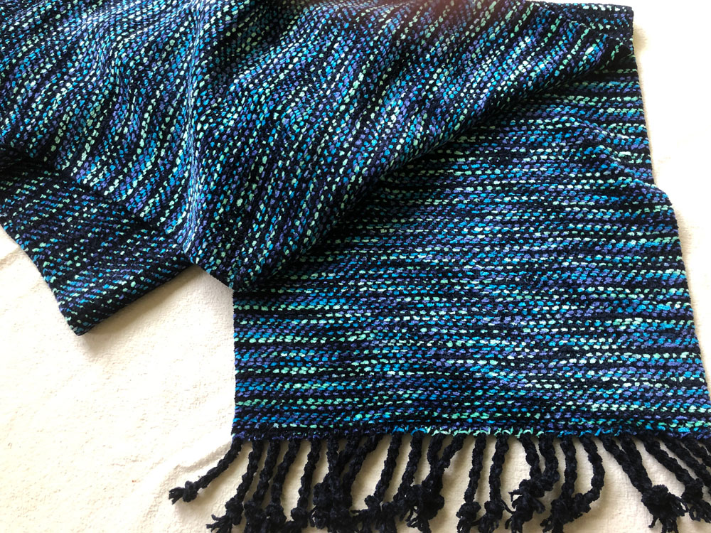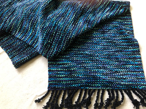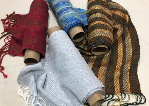 Four scarves woven 100% in a new fiber to him. Bamboo! It has super drape and is very light weight. A possible substitute for more expensive silk.