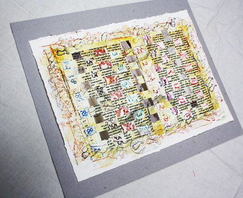 Claudia worked this great art piece in her own hand made paper. The text is from Fibonacci's "Liber Abaci" which dealt with calculatiion.