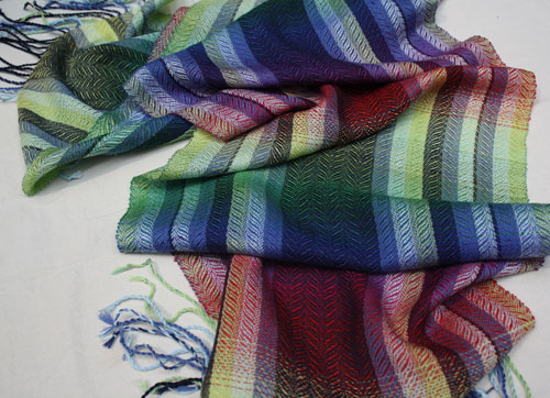 Fibonacci sequence is in the weft patterns. This was done in lushious cashmir and silk. We couldn't keep our hand off of it..