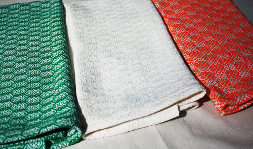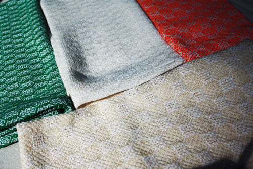 The three towels were from the same cotton warp with different treadlings. The suplemental one was woven with Irish linen.