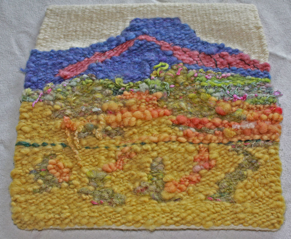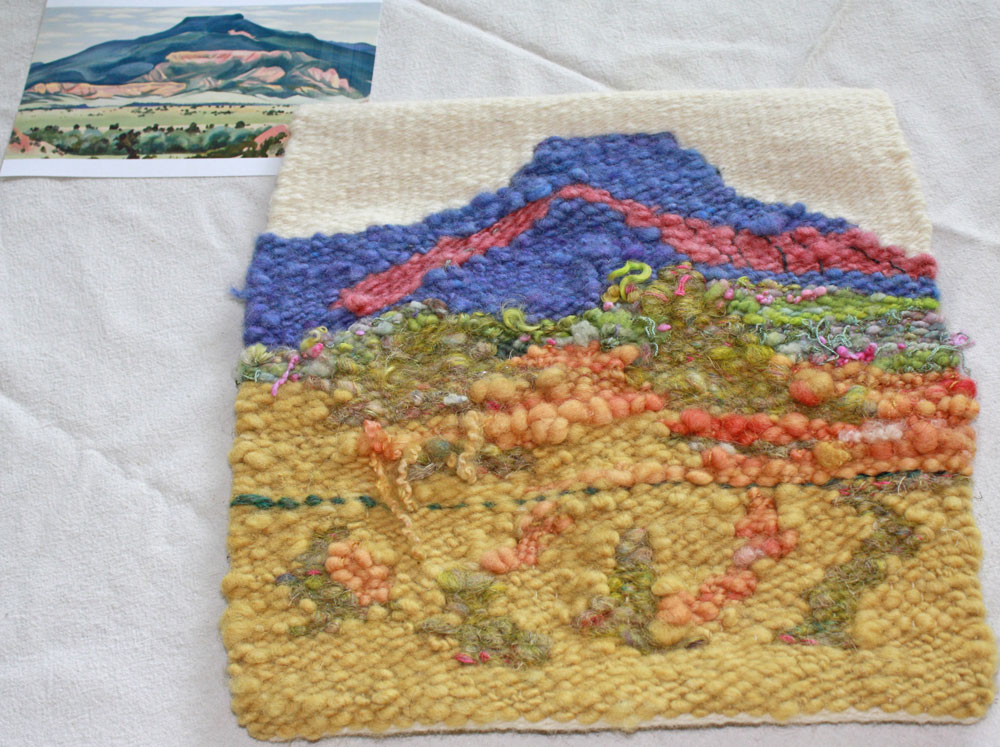 Carol took her inspairation from some of the watercolors that Georgia painted of the New Mexico landsscape. A lot of the wonderful texture is Carol's handspun wool. Picture in the upper left is inspiration.