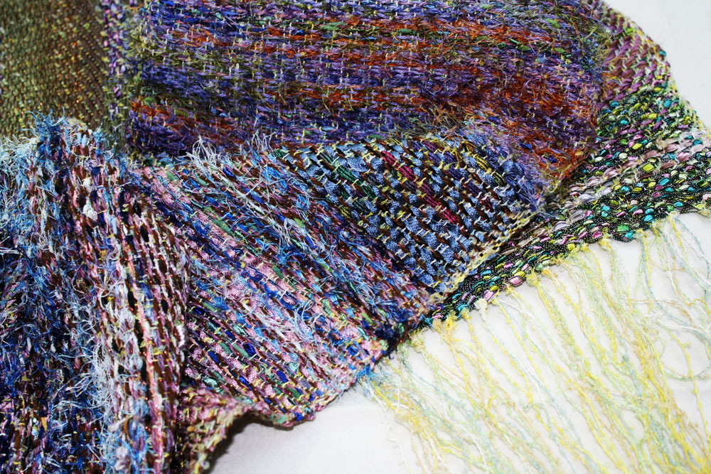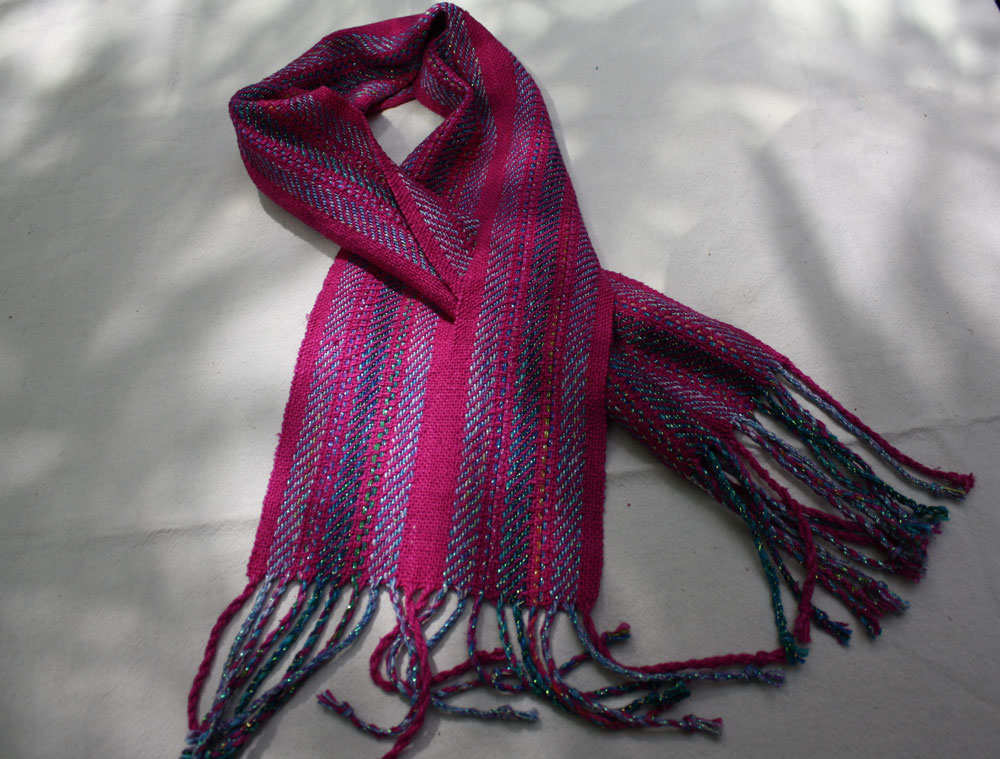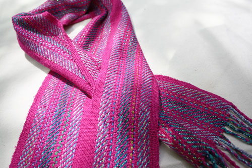 Carol had an interuption in the weft of this beautiful scarf. She created a slit to let the free end pass through. Clever!