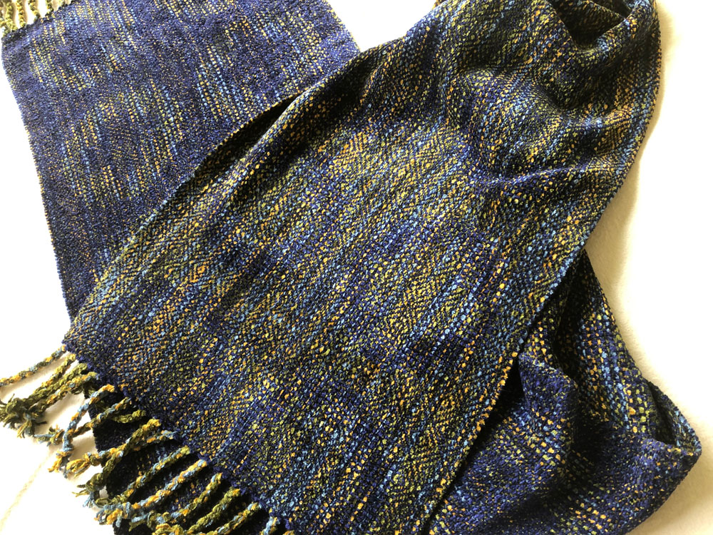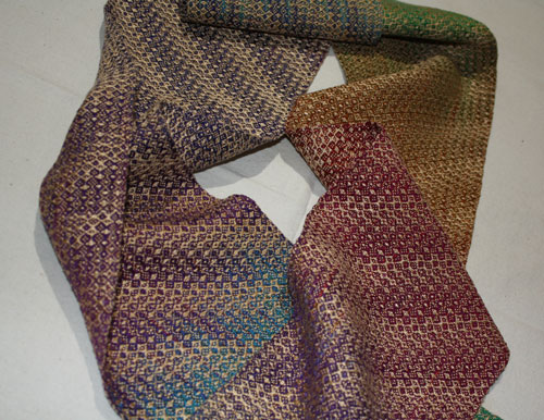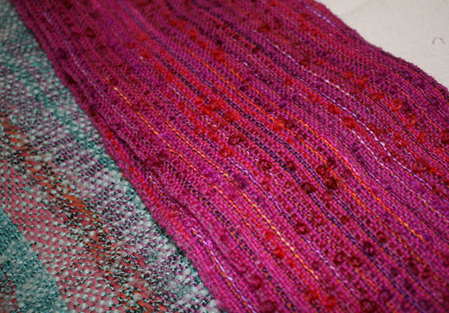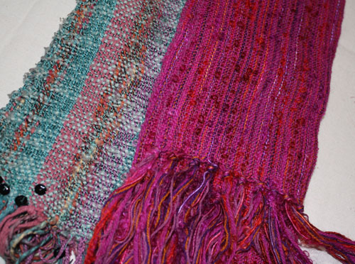 Carol too was reminded of lifes journey. The scarf on the left was an early hand woven gift from her mother that she truly loves. The scarf on the right plays on the themes in the original with lots of different threads in the warp.