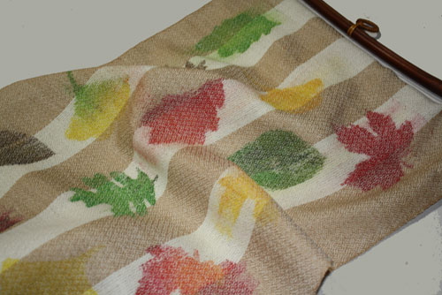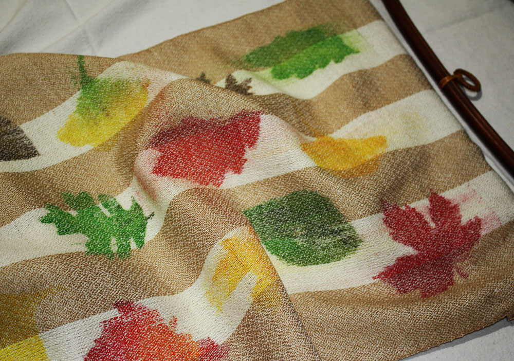 The warp was painted before it was woven. Real leaves formed the pattern for stenciling.