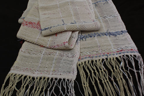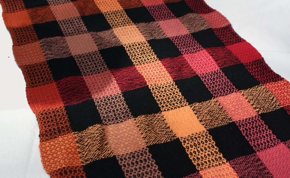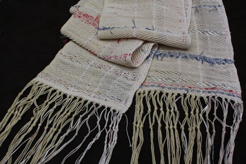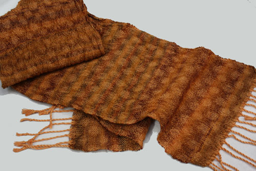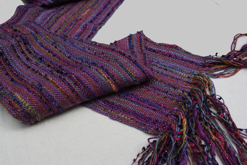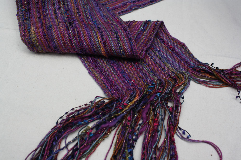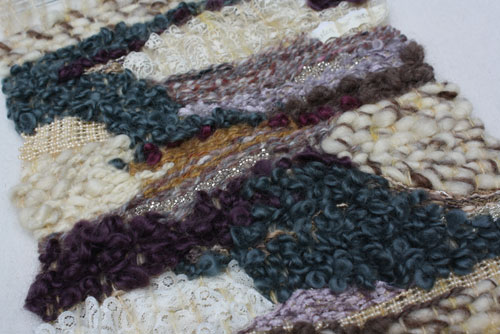 Carie got the lumpy and bumpy by mixing different weights of yarn in the warp. Some really beautiful colors here.