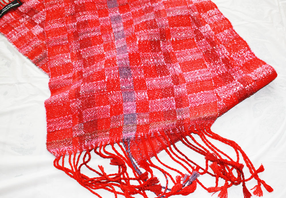 Terry's favorite color is red. So, of course, the warp would be in those colors. Weft is a paler shade is his handspun.
