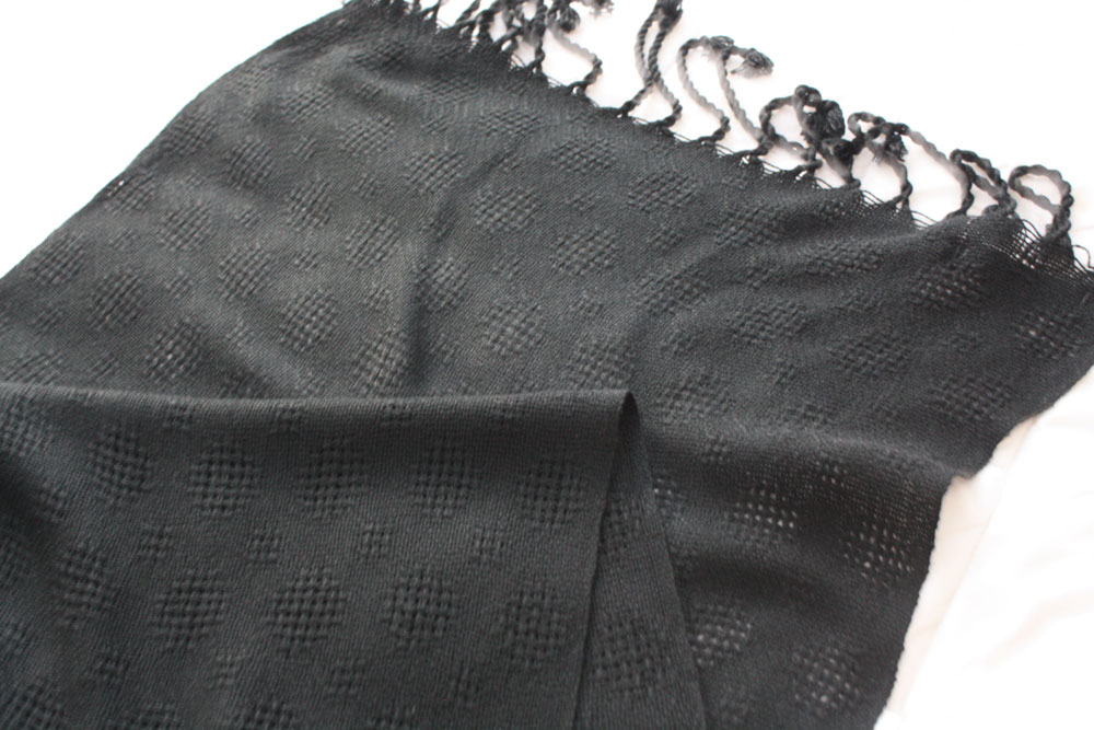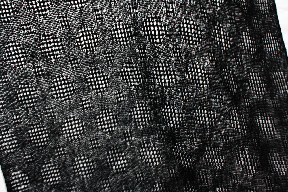 It is all 8/2 bamboo.This was one of the most difficult pieces he has done. The black warp AND black weft were difficult to see even in very good light.