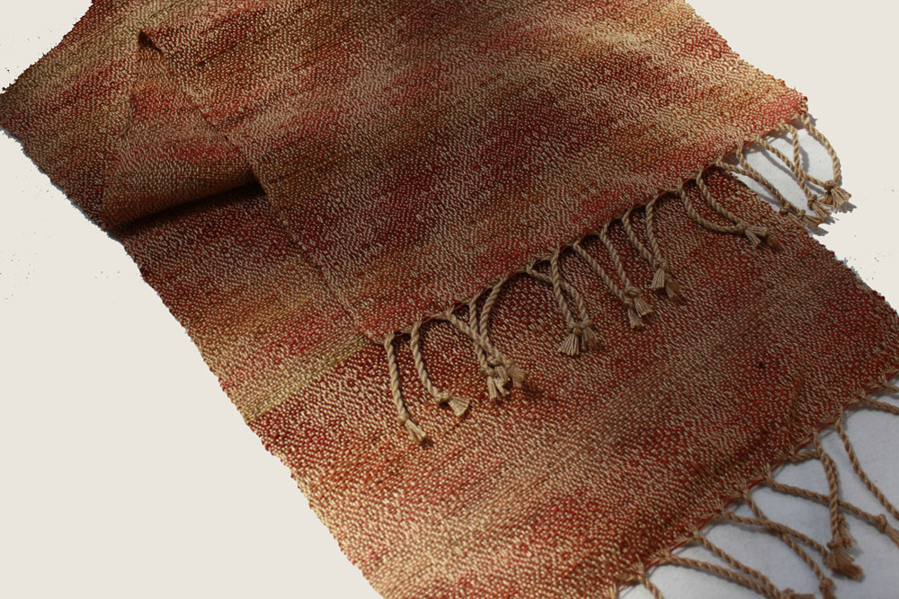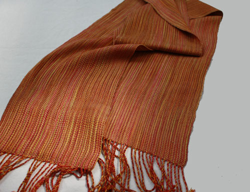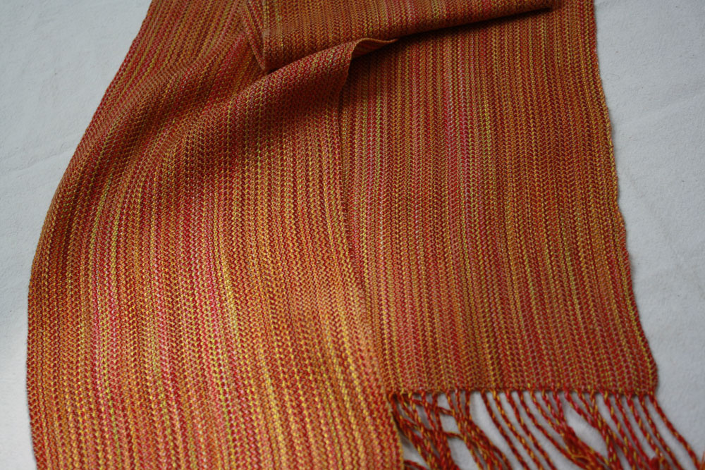 Really wonderful autumn colors in this beautiful scarf. We think Carie nailed it with this one. Warp is 10/2 tencel and the weft is 16/2 bamboo.