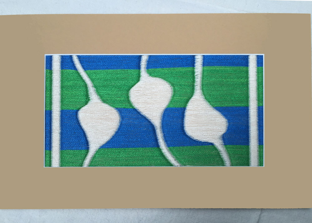The answer can be seen when she lifts up the framing mat. That's balsa wood she used for weft. What a gem!
