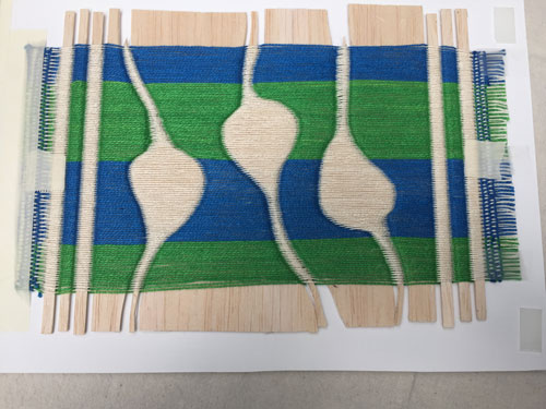 Along with some cotton in the warp Terry include some ribbon and some novelty "railroad track" yarn.
