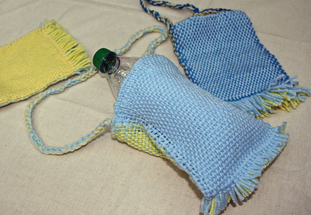 Barbara wove some clever tubes (round and round!) to make water bottle carriers.