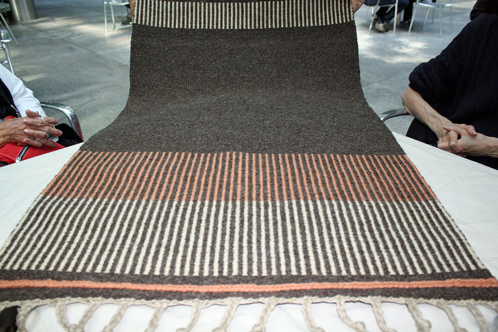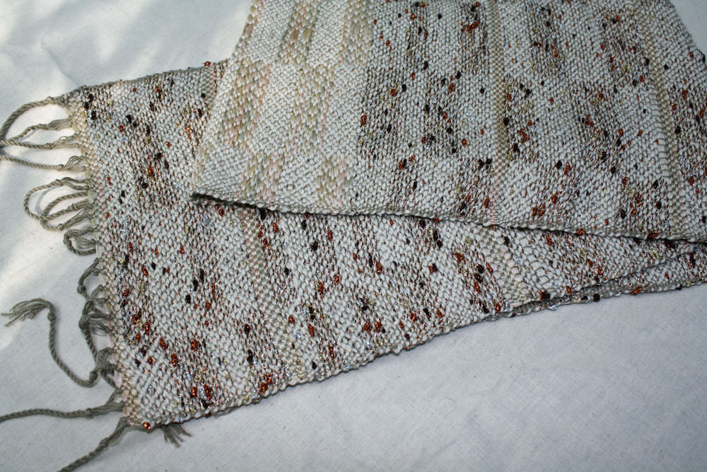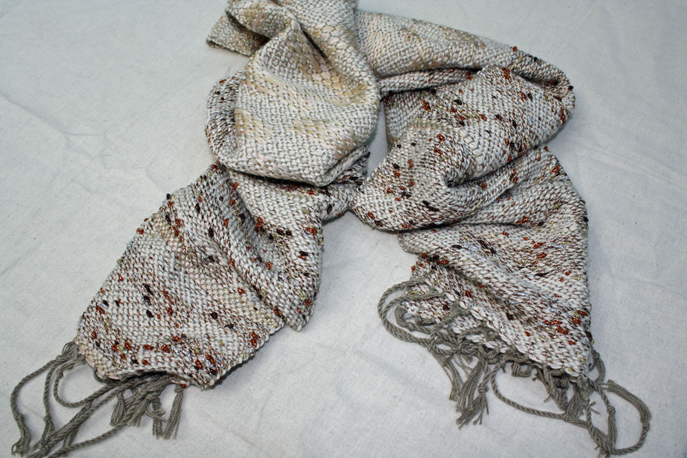Leila began this scarf with one kind of weft, changed and then back to the first ones. Round and round.