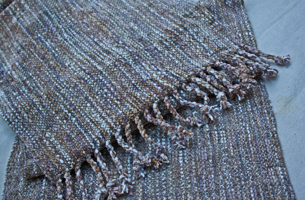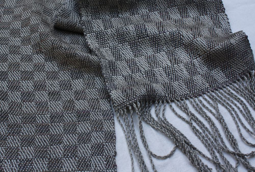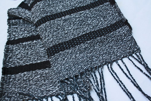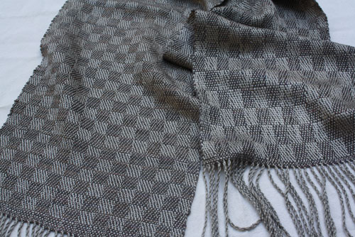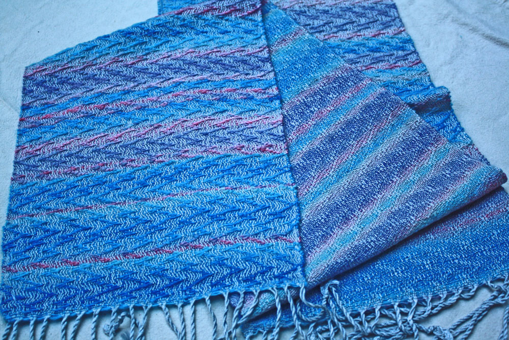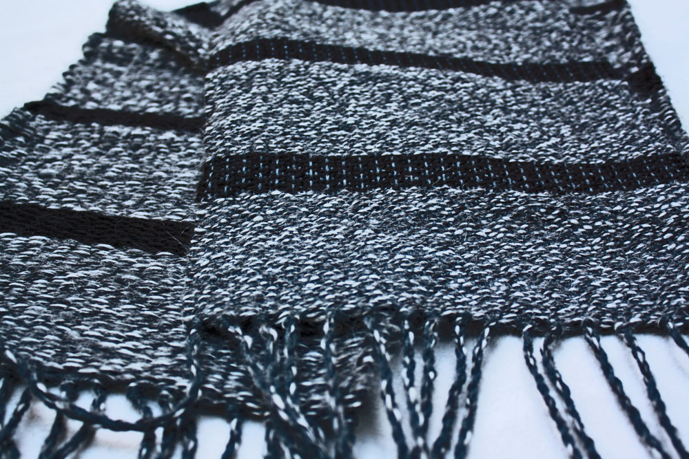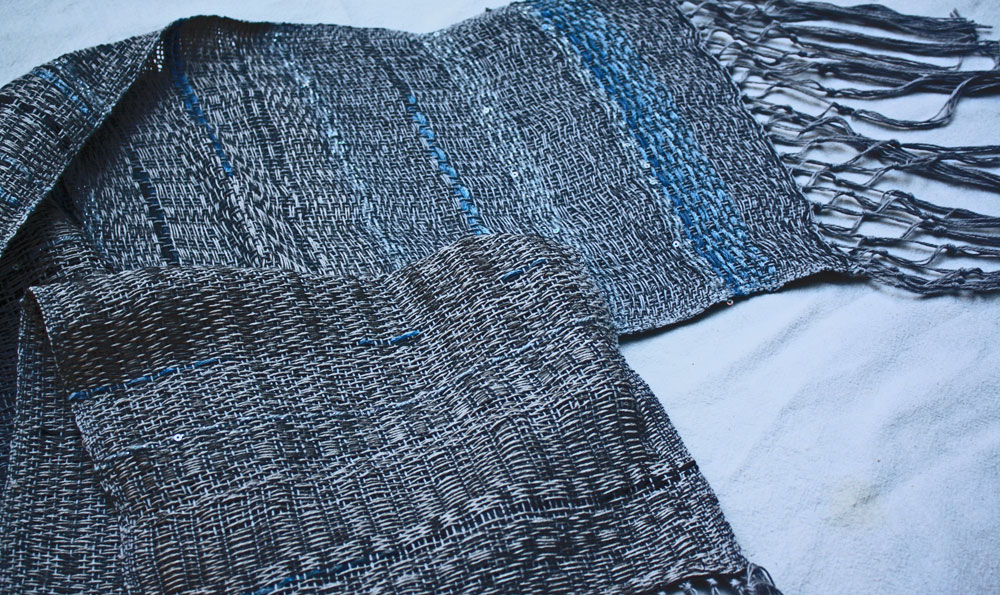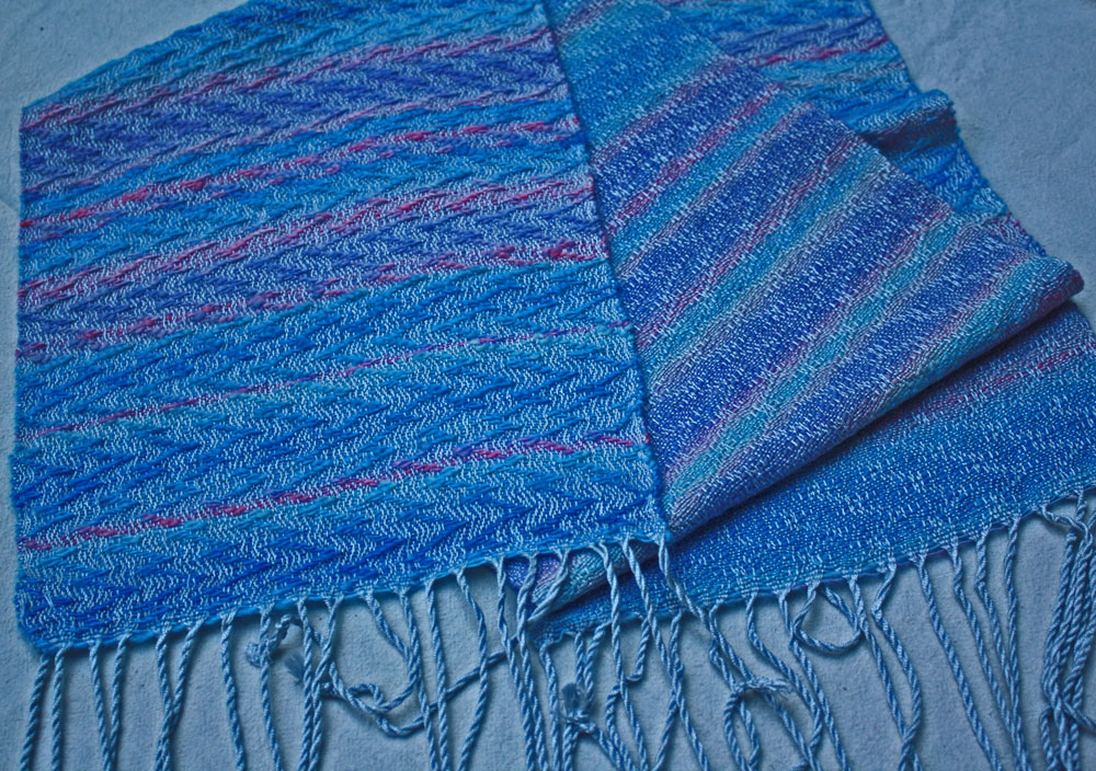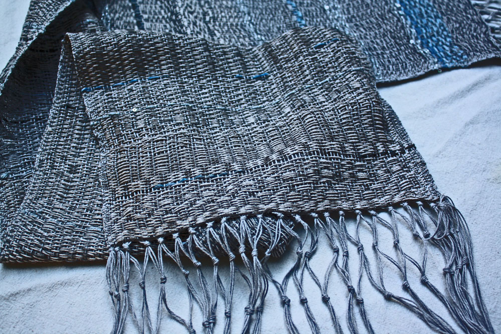 Terry once again used some of his handspun as weft for this scarf. The white and blue represent the smoke and the pinkish color the embers left.