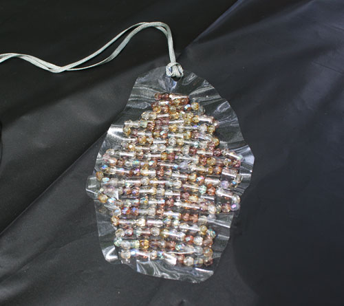 Claudia created this charming piece. Beads woven in the plastic. It works as a pendant on a necklace.