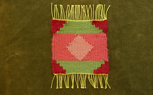 Carie has been working on a small tapestry loom and wove this on a trip to San Antonio. The design has quite a Native American Indian feel to it..