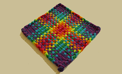 Darby used her jumbo potholder loom to make this colorful square. We all wanted it for our kitchen.