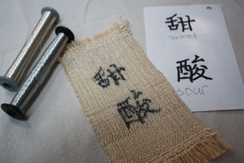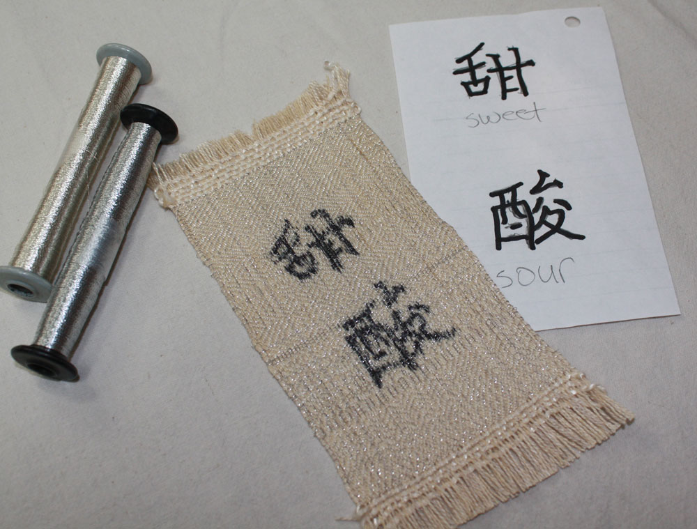 Claudia was thinking of Chinese "Sweet and Sour" soup. She found the characters for sweet and sour and drew then on the warp.