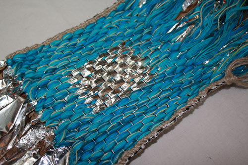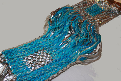 Katy worked this piece in some sticky metalic tape as well as some multiple strands of yarn.