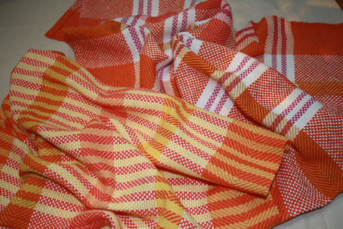 This looks realy tricky to do. You are working with the yarn for the ground weft as well as two other colors for pattern. Great results.