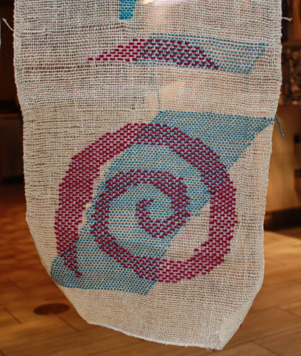 Terry showed this wall hanging. The tropical leaves were stecilled on the warp before weaving.