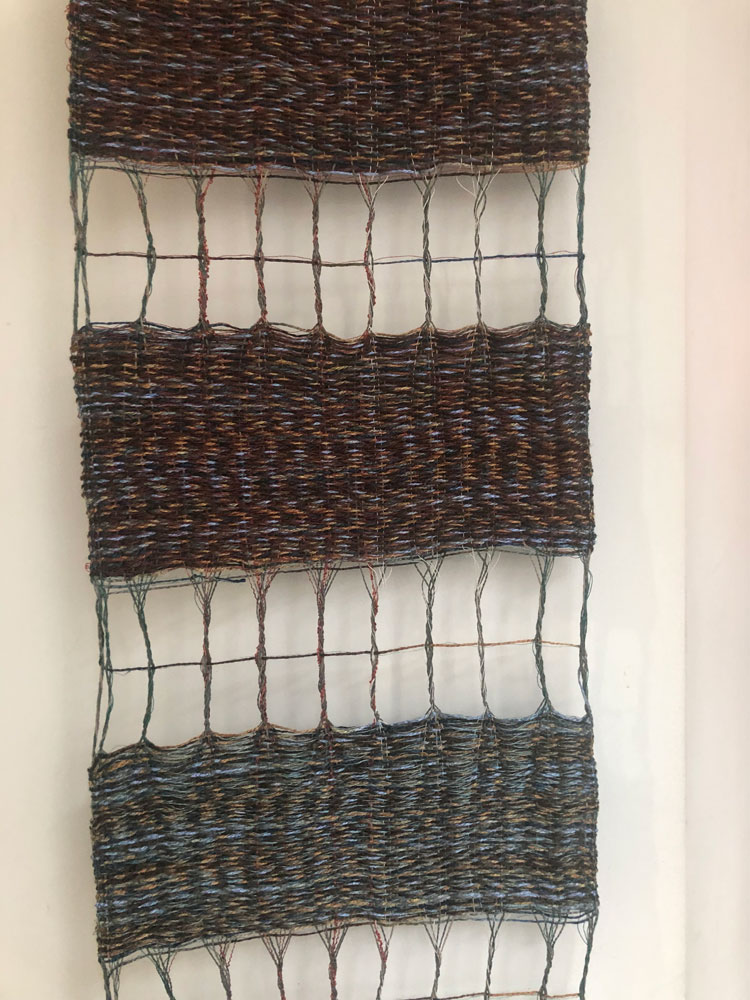 The warp is stainless steel!! Lots of really fine yarn in the weft. All adds up to a spectacular piece