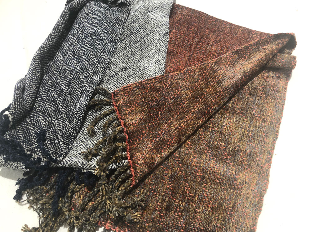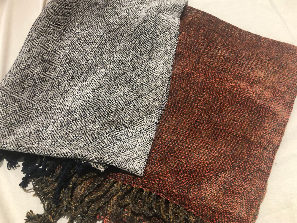 Both of these scarves by Ronnie are spectacular but she didn't like the fact that she couldn't see the pattern on the darker one. So she rewove it in the dark and light version.