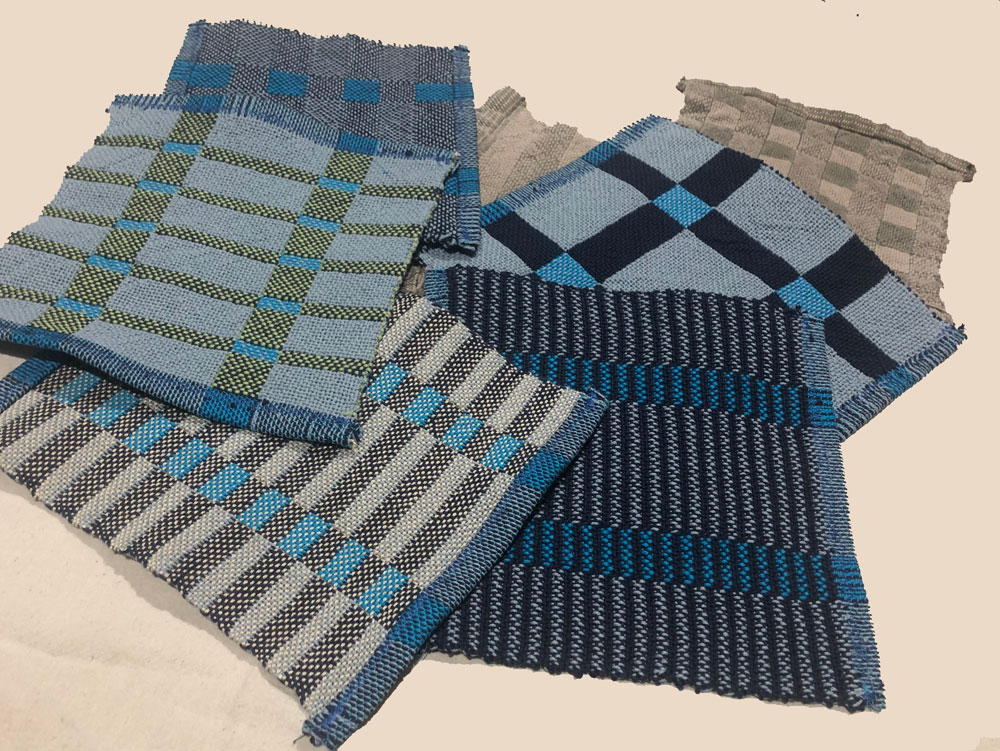 Terry needed to replace some pot holder that he wove over 30 years ago. The originals (the brown ones underneath) were getting pretty ragged. New ones are in the same block double weave technique.