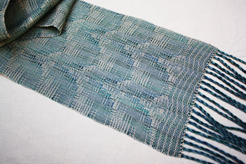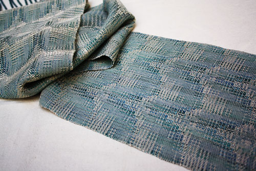 Woven in 16/2 bamboo. Not sure he would repeat this because of the excentric threading and treadling. Still . . . .